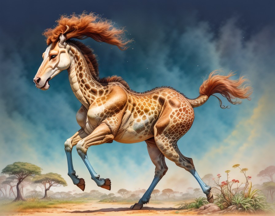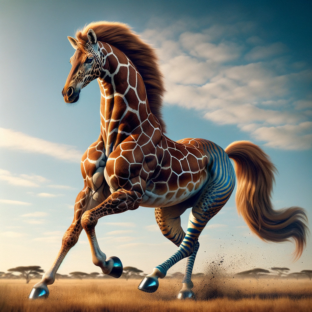 A majestic unicorn with a giraffe pattern and rainbow mane gallops across a savannah under a blue sky.