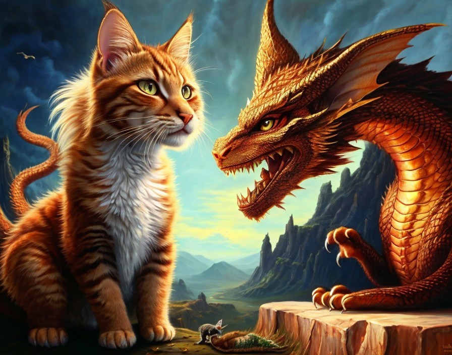 Prompt: "An oil painting, the dragon Smaug from lord of the rings fights against a kitten on left side of the picture, dragon on the right side of the picture. The kitten is a persian angora cat and the dragon is a chinese dragon."