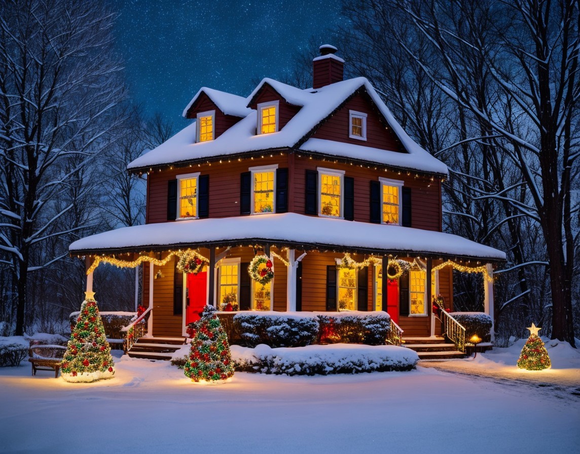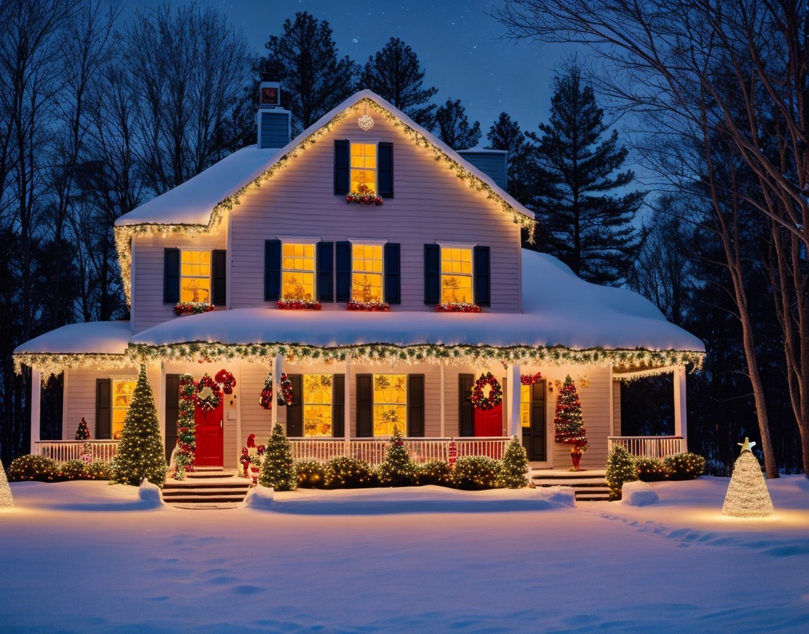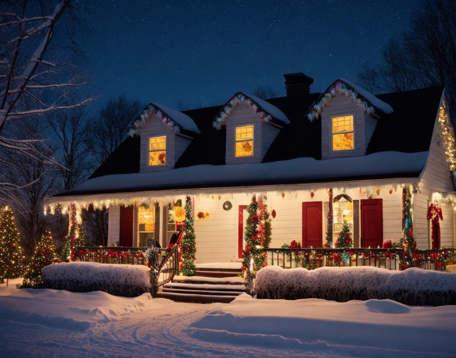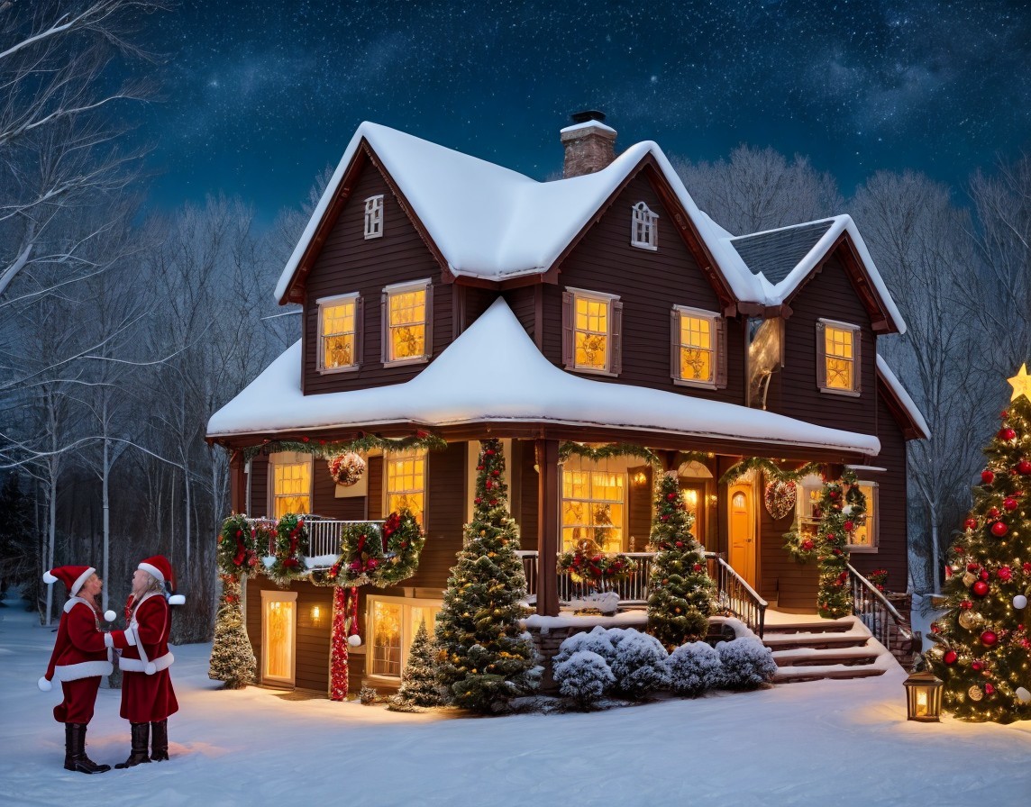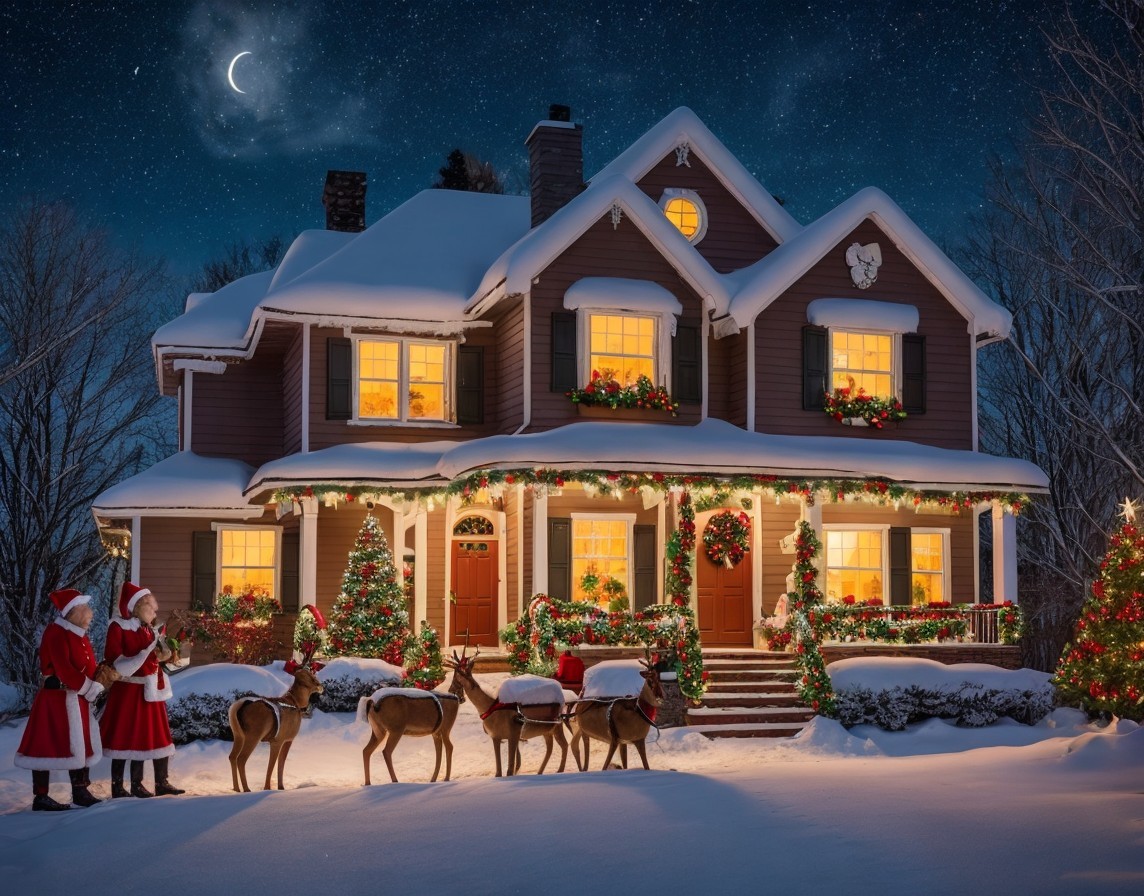 Prompt: Vintage house with lots of bright lights trimming and Christmas decorations. Christmas carolers singing on the front yard. Night sky full of stars and Santa's sleigh and reindeer flying over the house.
