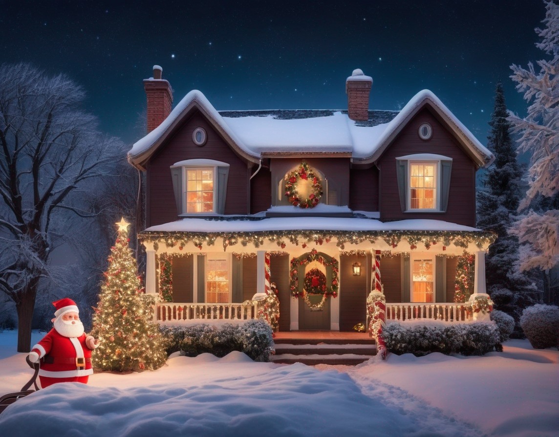 Prompt: "Vintage house with Christmas decorations. Christmas carolers singing on the front yard. Night sky full of stars and Santa's sleigh and reindeer"