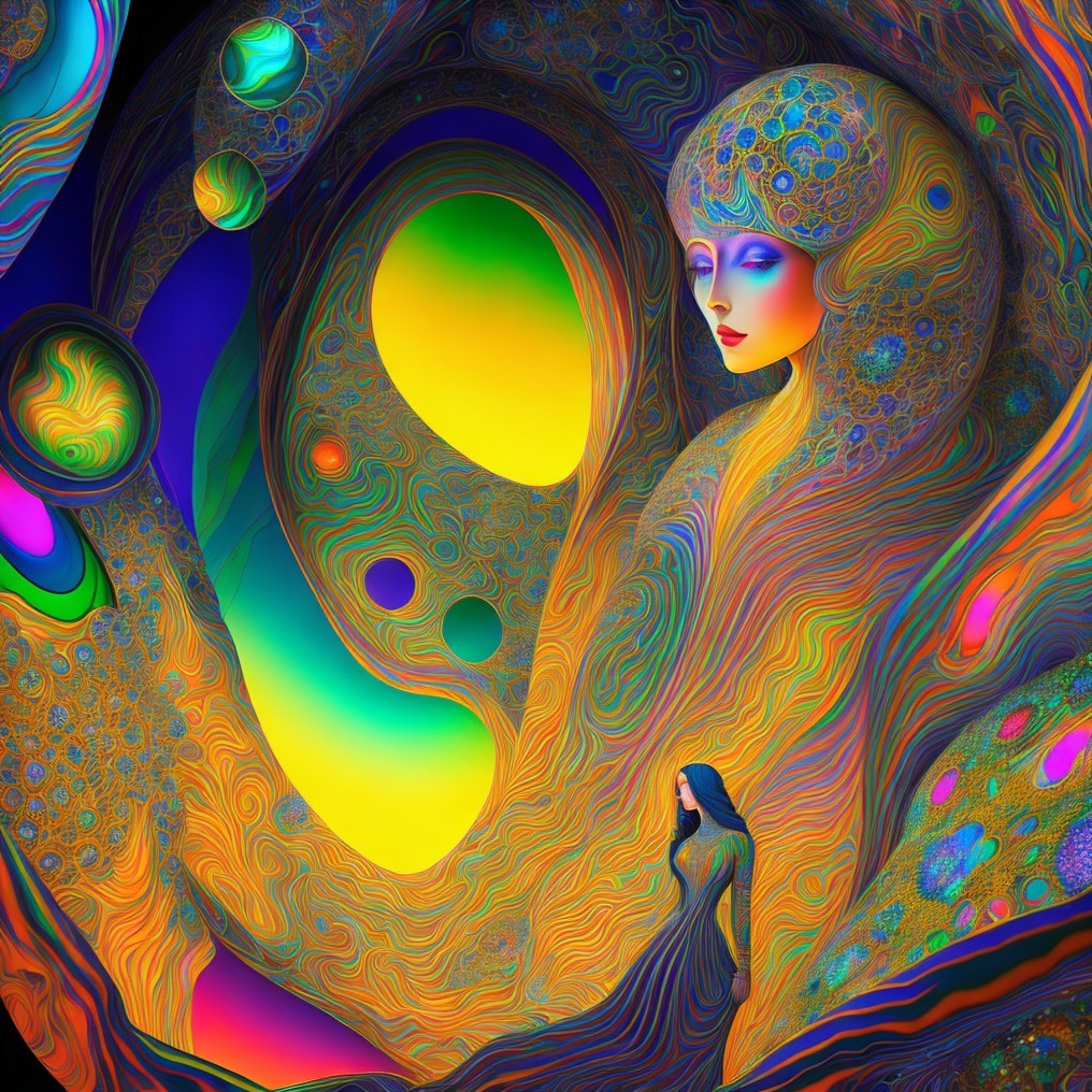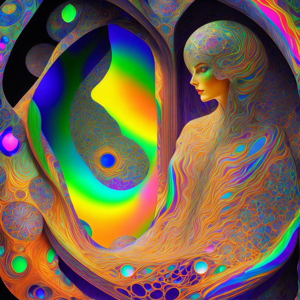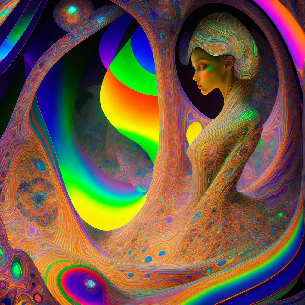 Woman in a Rainbow colored art deco room ,Escher style, cosmic landscape, glass Orbits, cyber dream, light and dark, depth, surrealism,Marbled colored organic Alien stone ecosystem by harry clarke , Herbert James Draper, acid colors, fractals, smooth, sharp focus, symbolism, luminescent, translucent skin, bioluminescence, Karol bak, oil on canvas, hyperrealism, hyper detailed, salvador dali style, vibrant colours,