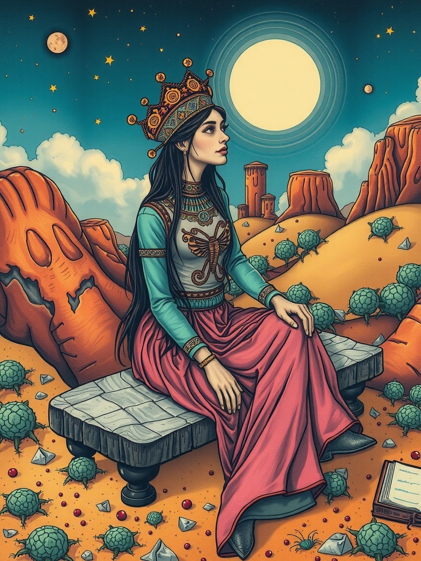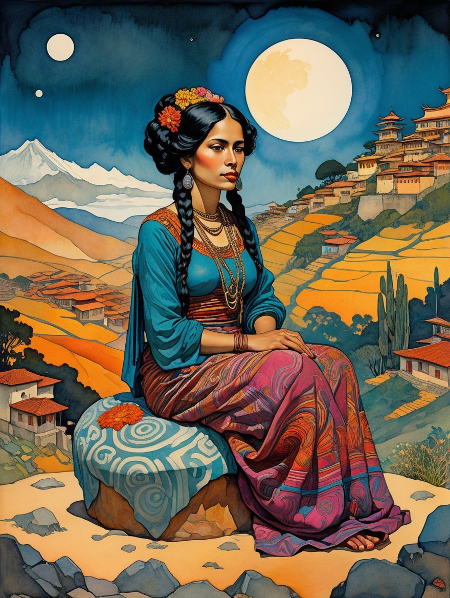 Serene Woman in Traditional Attire Amidst Scenic Landscape