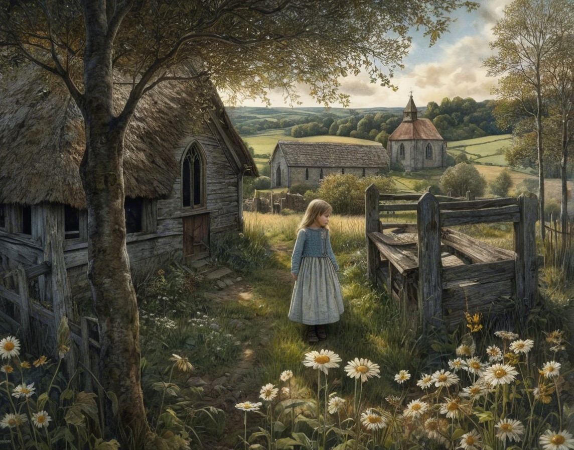 A young girl stands in an abandoned, overgrown church. Sunlight filters through stained glass windows, casting a serene glow on the weathered pews and stone walls, creating an evocative, tranquil scene.