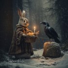A fluffy rabbit wearing a cloak holds a basket of bread and a lit candle, standing in a snowy forest beside a curious raven, creating a whimsical, magical scene.