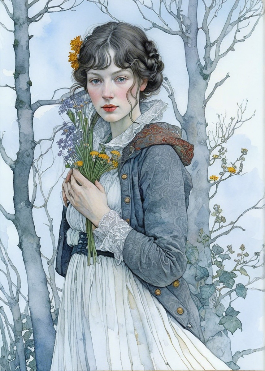 A young woman stands by a window, gently holding a bouquet of flowers. She wears a muted blue jacket and a white dress, her thoughtful expression reflecting a serene connection to nature.