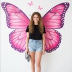 A young woman stands against a large, vibrant butterfly mural, featuring pink wings. She's casually dressed in a black t-shirt and denim shorts, with pink sneakers and a beaded purse.