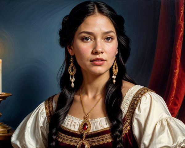 A woman adorned in rich purple attire and intricate gold jewelry, with flowers in her hair, poses elegantly against a warm backdrop.