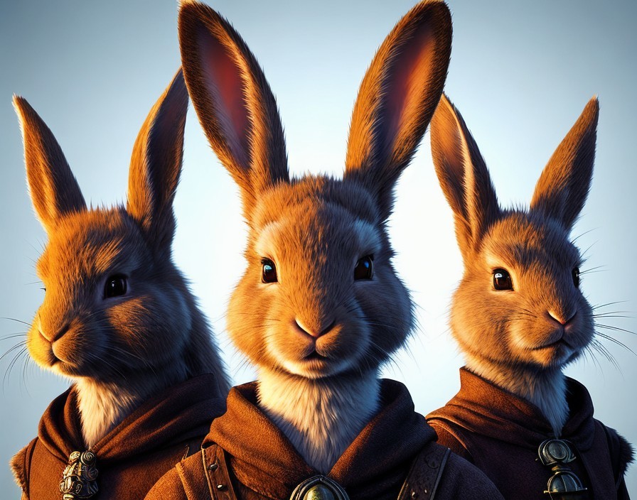 Three anthropomorphic rabbits dressed in cloaks, with expressive faces and large ears, standing close together.