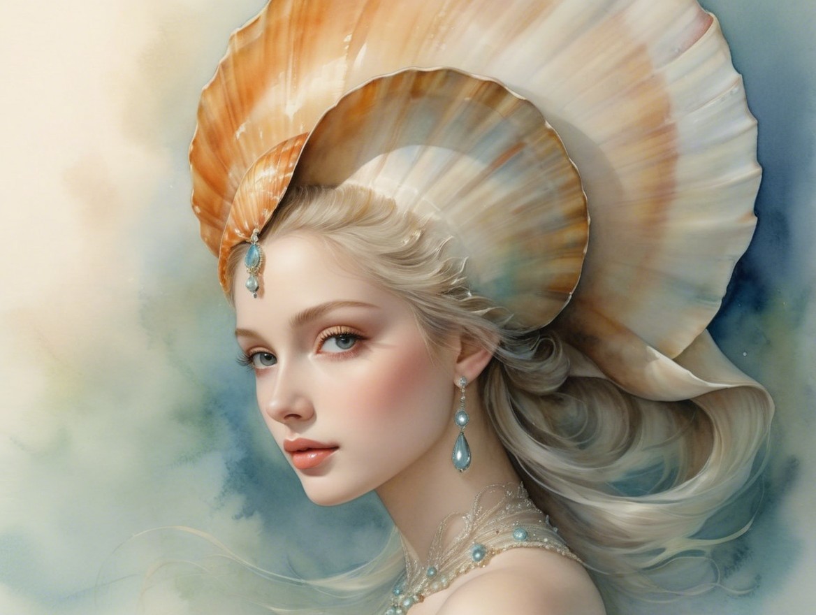 A graceful woman adorned with a large seashell headdress, featuring delicate jewelry and flowing, wavy hair. The soft watercolor background enhances her ethereal beauty.