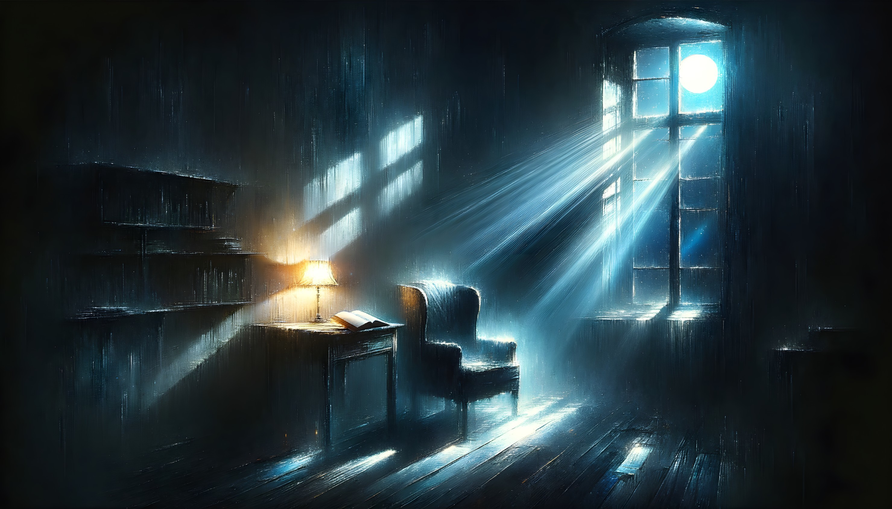 A digital painting depicting an empty room with a single armchair, an abandoned book, and dimly lit lamp. The scene is bathed in soft moonlight, creating a serene and introspective atmosphere with a melancholic color palette.