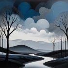 A serene landscape features stylized mountains under a starry night sky, with a glowing moon illuminating trees and a tranquil river, creating a dreamlike, peaceful atmosphere.