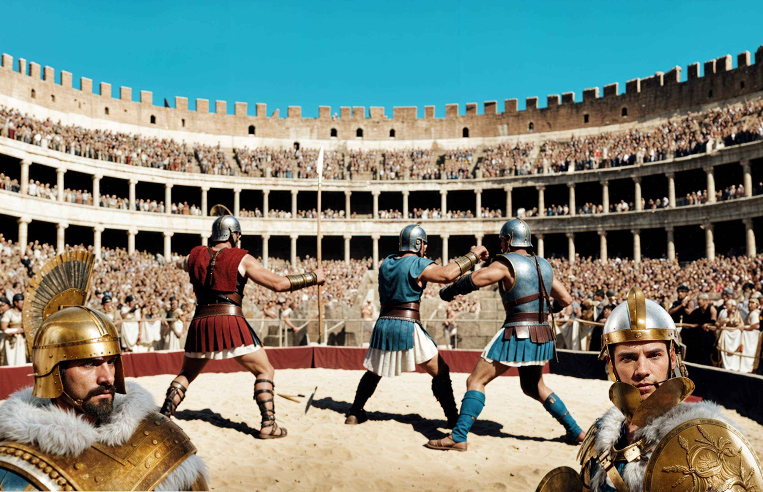 In a grand arena, gladiators in armor engage in combat, surrounded by a cheering crowd. Sunlight illuminates the scene, highlighting the intensity of the battle and the spectators' excitement.