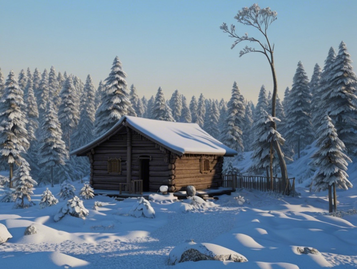 A cozy wooden cabin nestled in a snowy forest, surrounded by tall, frosted pine trees and a serene winter landscape, under a clear blue sky, evoking a tranquil, peaceful atmosphere.