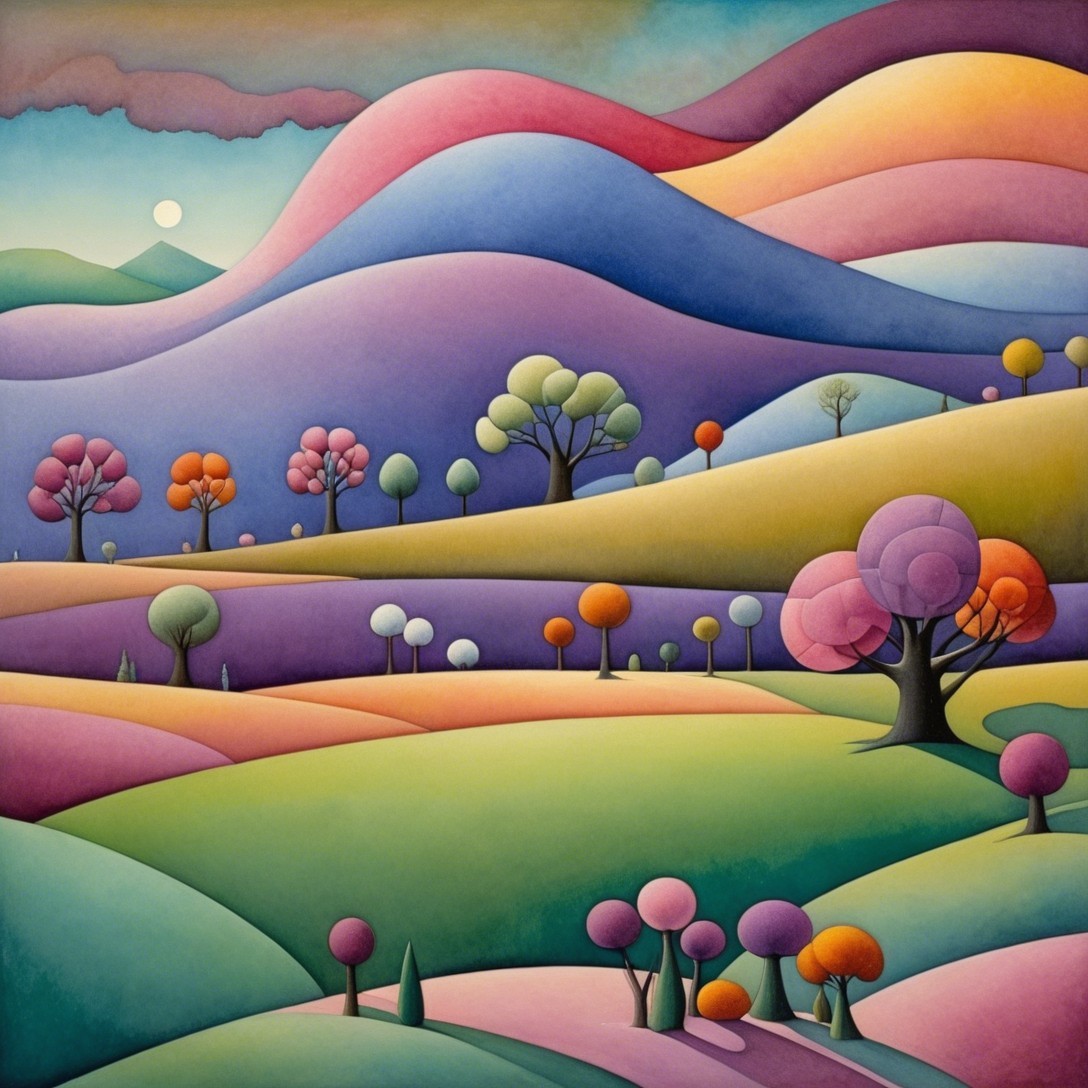 The image features a colorful, abstract landscape with rolling hills, stylized trees in vibrant shades of pink, green, and blue, set under a starry sky. It evokes a dreamy, whimsical atmosphere.