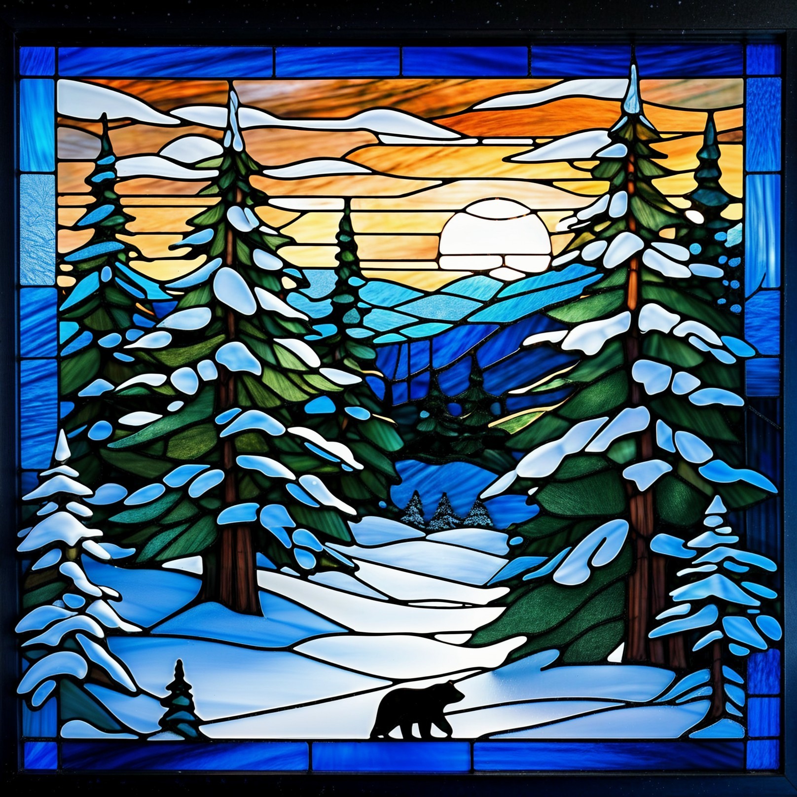 The image features a vibrant stained glass scene with a majestic bear near a tranquil lake, framed by snow-covered evergreen trees and a radiant sunset over mountainous landscapes.