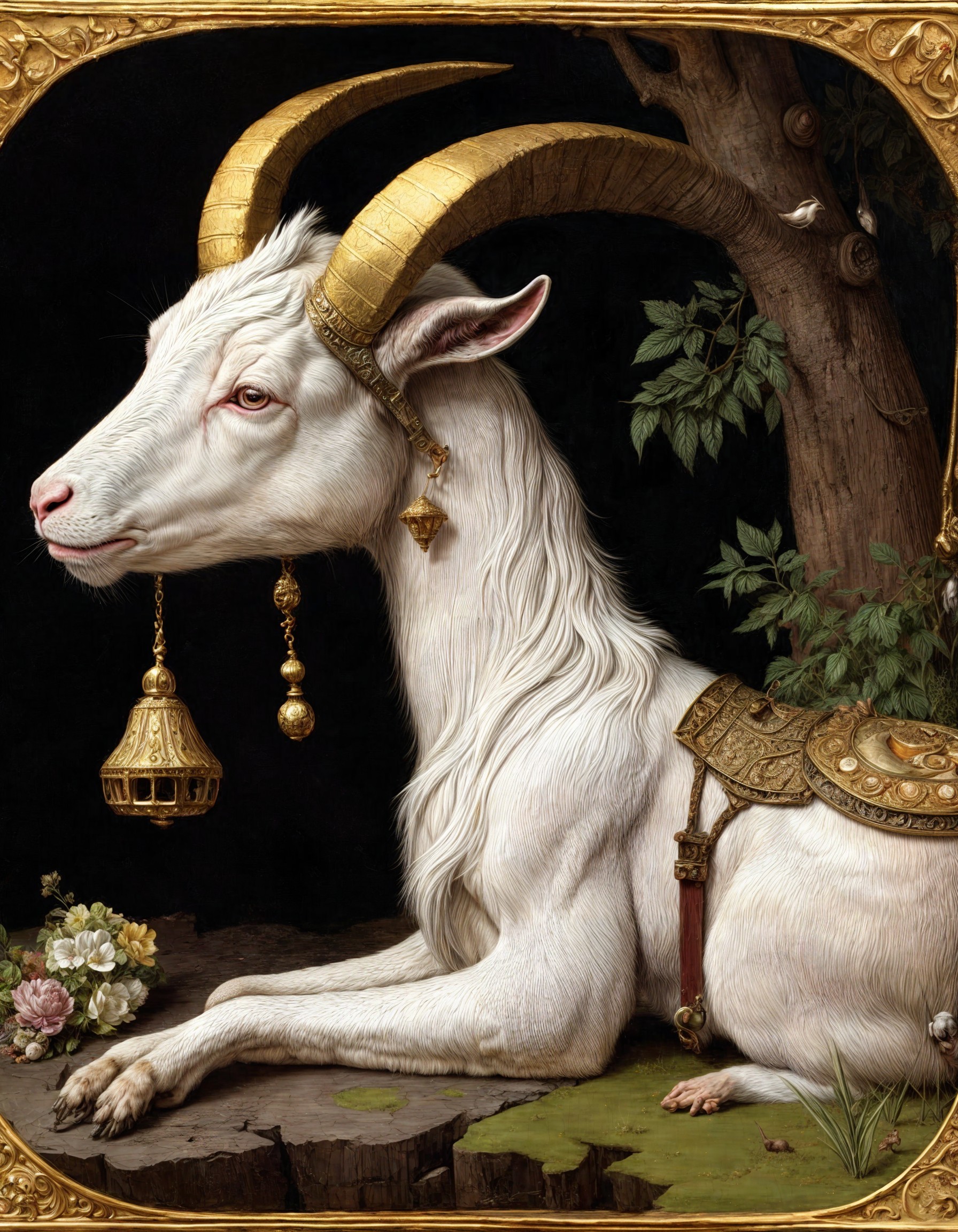 A regal, anthropomorphic goat lounges gracefully, its golden horns adorned with intricate details. Surrounded by whimsical elements, it exudes a sense of fantasy and elegance in a lush setting.