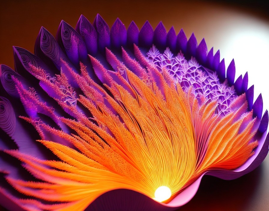 Colorful digital artwork: Fiery orange fractal pattern with purple edges on softly lit background