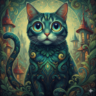 A portrait of a cat with a hypnotic and amazed look. Its eyes, abnormally large and round, are like two luminous orbs, a deep blue surrounding a bright yellow. Everything else in the scene, from the spiral patterns on her body to the warped houses in the background, seems distorted by the intensity of her gaze. Art nouveau style mixed with surrealism, dreamlike atmosphere.