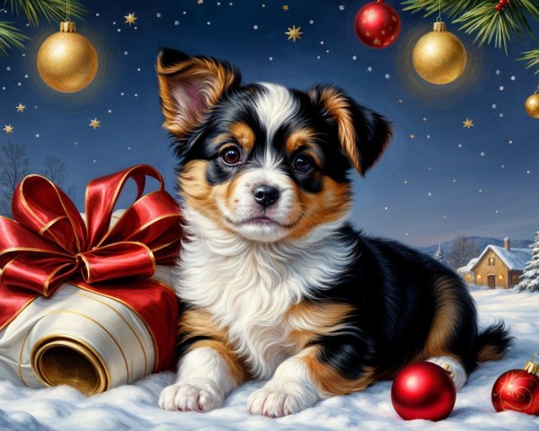 A fluffy, light-colored dog with expressive eyes and perked ears rests on a polished surface, exuding an air of charm and playfulness in a classic setting.