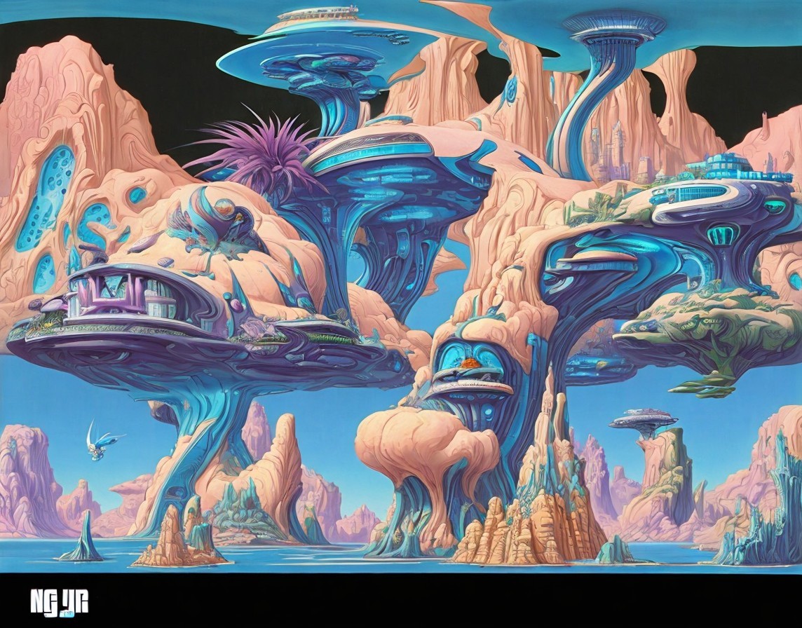 Retro-futuristic illustration of towering mushroom-like structures amid futuristic buildings and rock formations