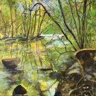 A serene watercolor scene depicting a tranquil stream surrounded by vibrant greenery. Sunlight reflects off smooth stones, creating a peaceful aura of nature and calmness.