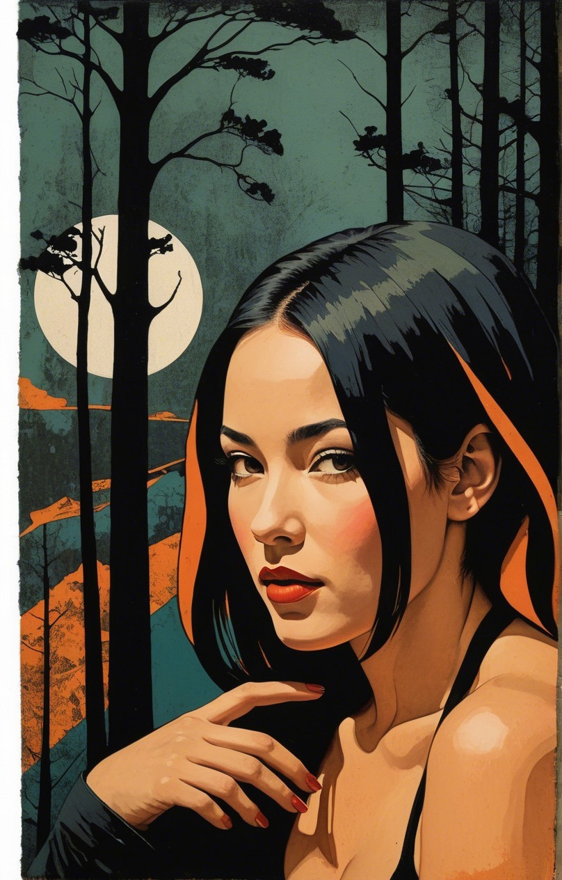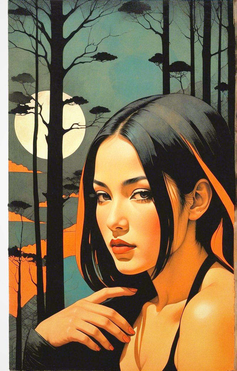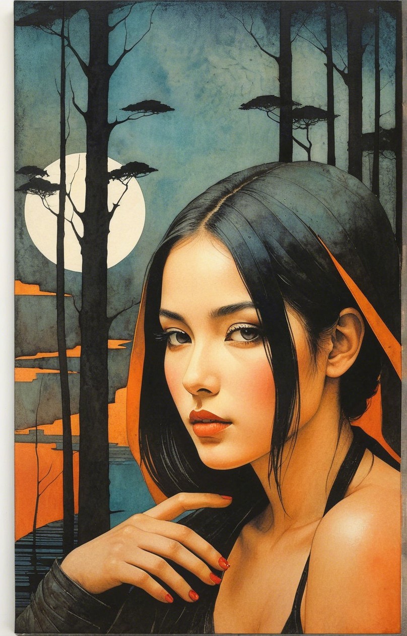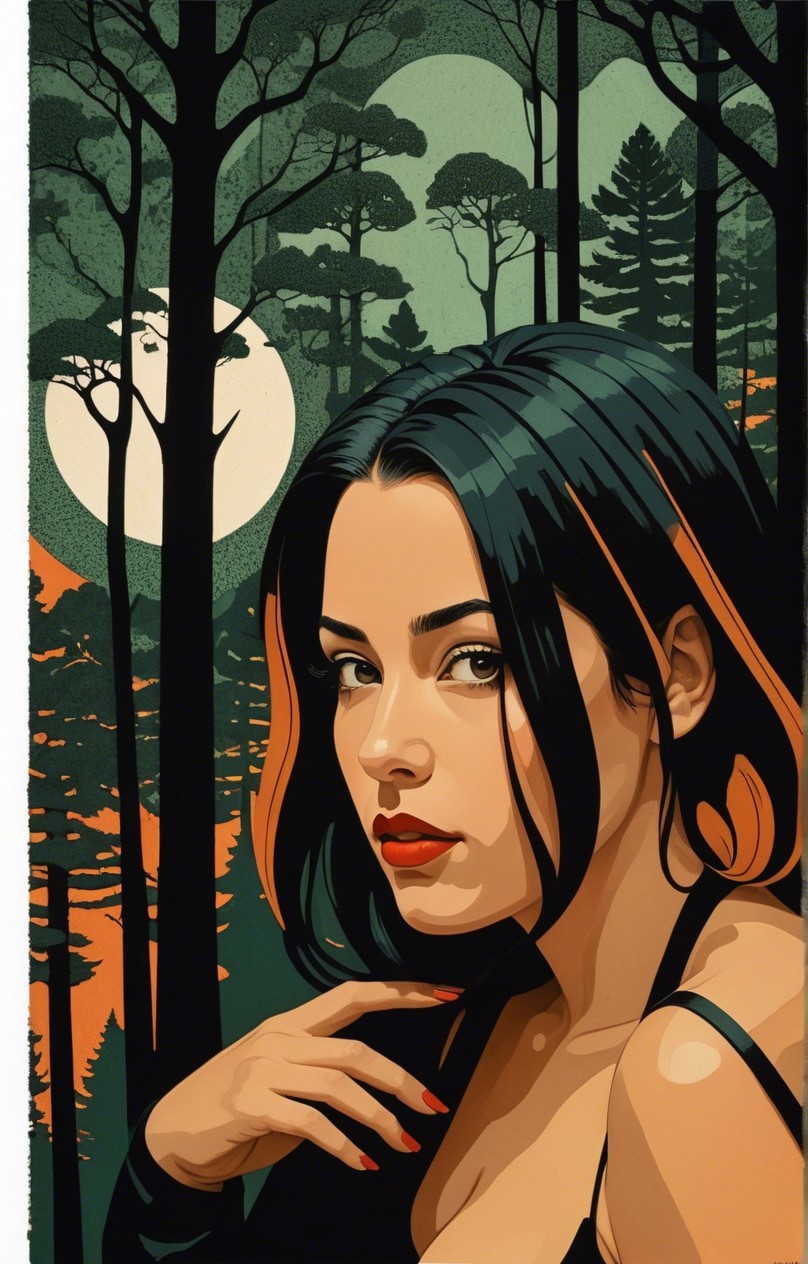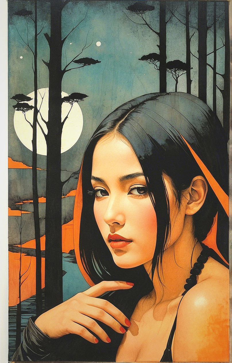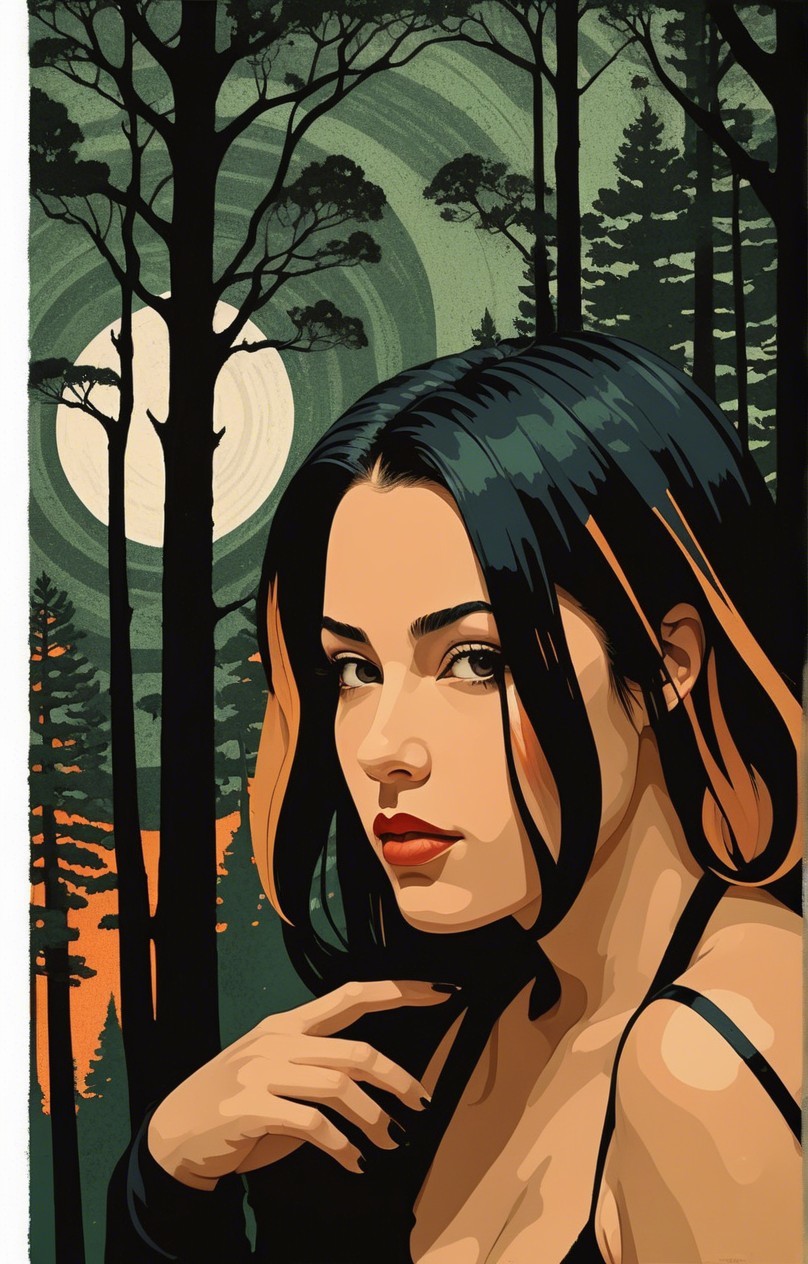 A striking portrait of a young woman with long black hair, set against a moody backdrop of trees and a full moon. Her expressive gaze and vibrant colors create a captivating atmosphere.