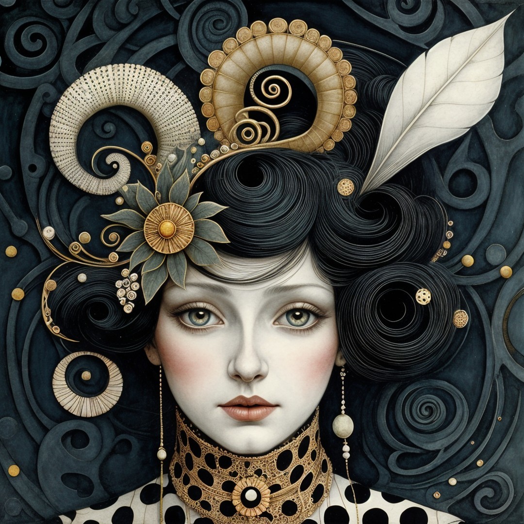 The artwork features a striking female figure with a unique headdress adorned with circular patterns and bold colors. Her captivating gaze and intricate details create a mesmerizing, ethereal vibe.
