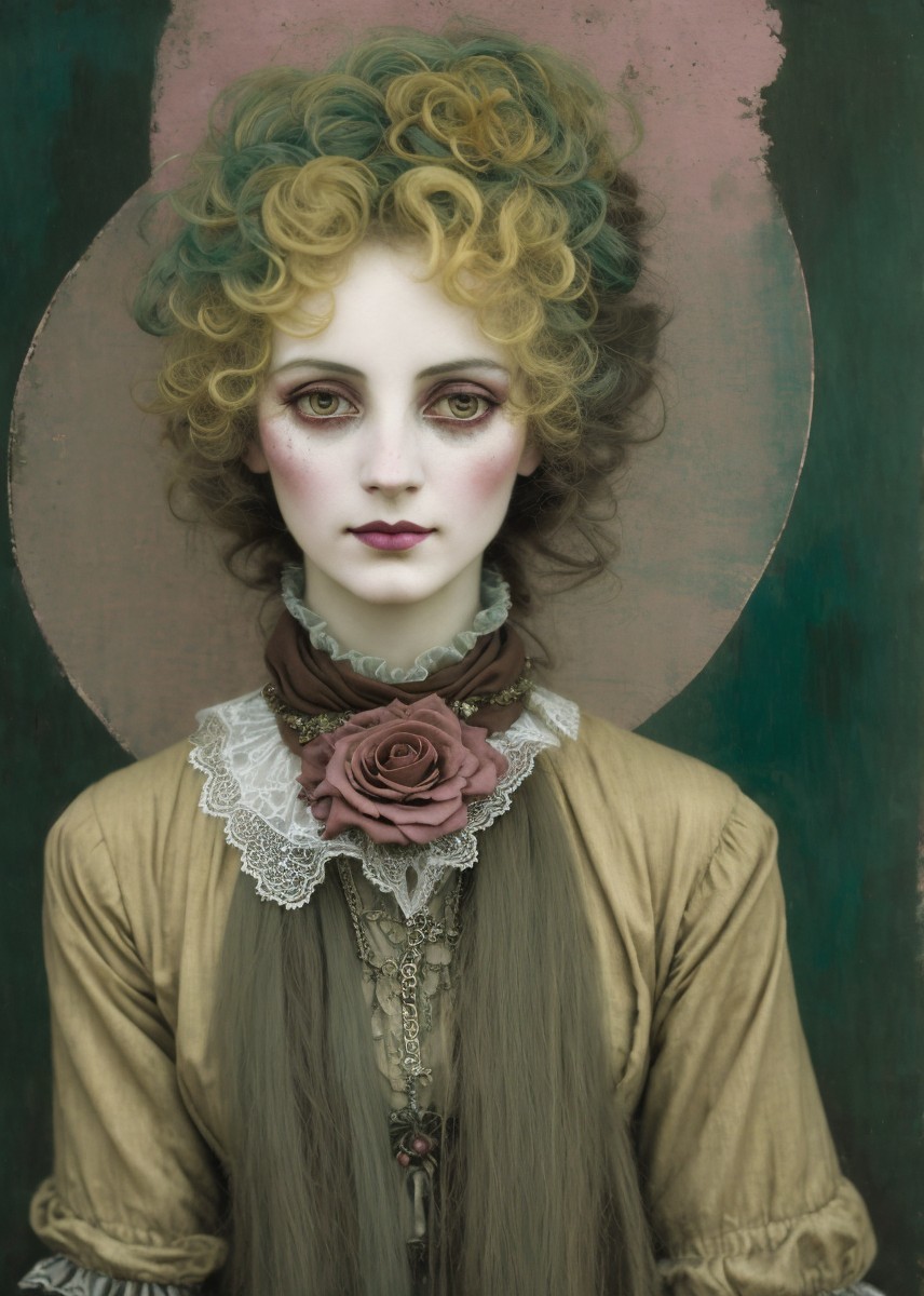 A painting of a woman with an ethereal gaze, wearing a vintage dress and adornments, with a muted color palette.