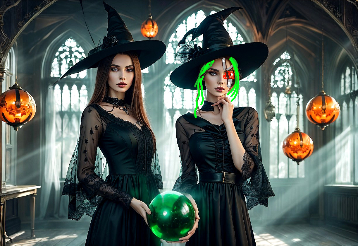 + Prompt:Witches, scary, with hats, gorgeous women, stunning portrait, green orb, gorgeous portrait, beautiful portrait image, by Fyodor Rokotov, by Vladimir Novak, photo of beautiful WITCHESt, by Andrey Esionov, by Hristofor Zhefarovich, beautiful model, very beautiful woman ,elegant extremely detailed Award winning photography, studio lighting, 8k photorealistic 4k, very attractive beautiful, award winning fantastic view hyperrealistic, 4K 3D