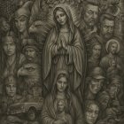 A woman in a silver hooded garment stands amid colorful skulls, exuding an aura of mystery. Her expression is serene, surrounded by vibrant hues of gold, blue, and orange, creating a striking contrast.