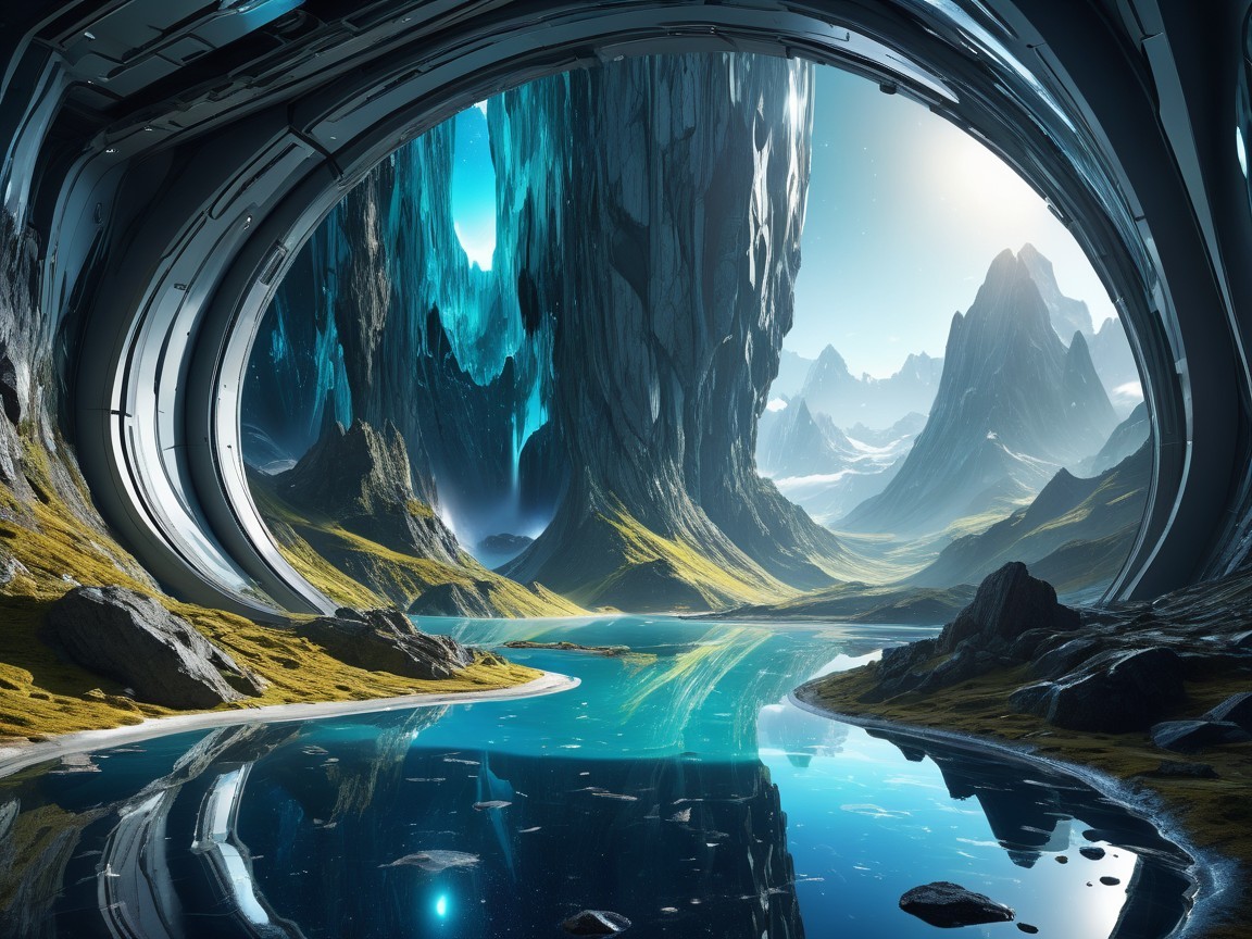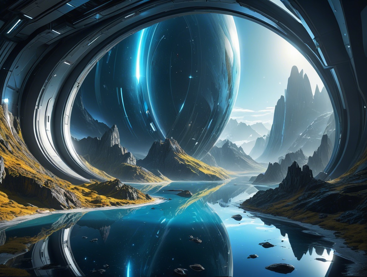 A breathtaking sci-fi landscape featuring a serene river reflecting towering mountains and a massive, glowing planet ringed by intricate structures, set against a vibrant sky.