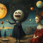 A surreal scene with a moon-faced figure in a dark dress juggling planets, while a girl with feathered wings watches. In the background, a group of figures and celestial bodies float above an ocean.