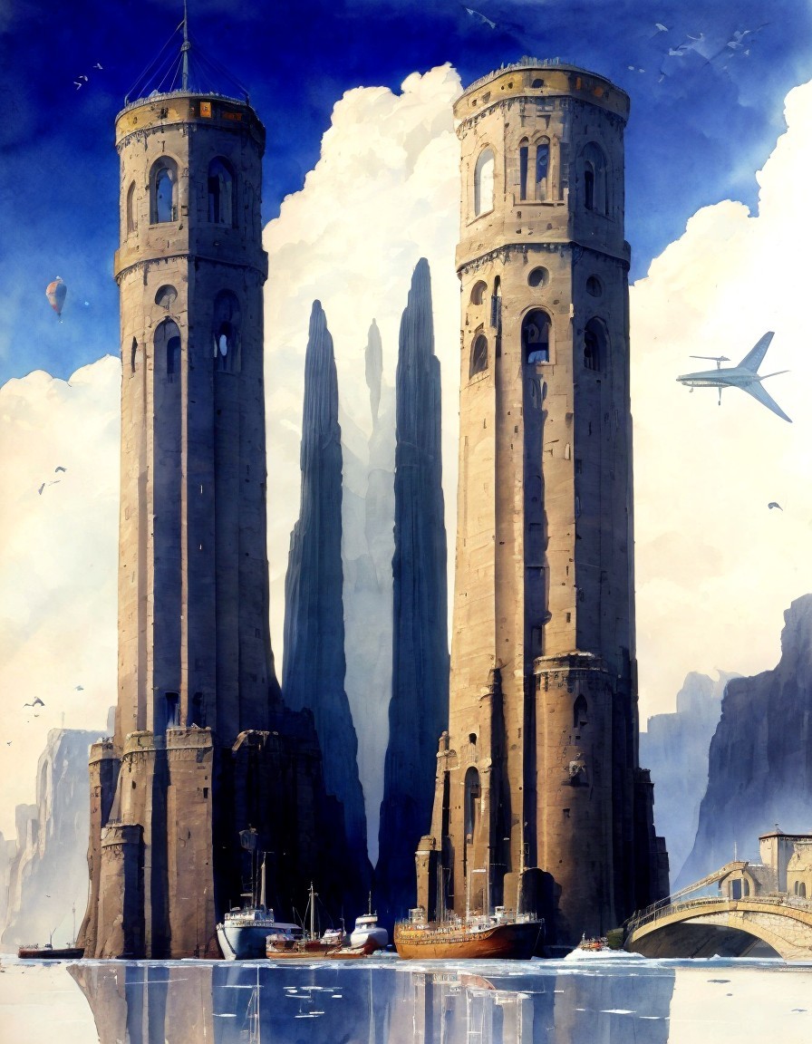 Prompt: "Art Nouveau Paleolithic urban architecture in ice cliffs, street, buildings, arches, towers, bridge, trees, port, harbor, harbor cranes, ships, factory pipes, oil derricks, mountains, clouds, hot air balloon, airship, airplane, wet to wet watercolor, architectural drawing, article, front view with plan, pen, [black ink], colored markers, muddy tones, high definition, colored, intricate detailed"