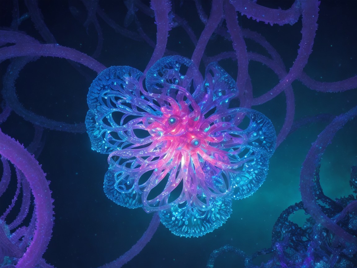 A vibrant, ethereal flower with glowing petals in shades of blue and purple, surrounded by translucent jellyfish, creating a mesmerizing underwater scene.