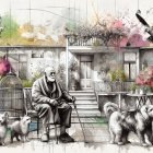 Watercolor Scene of an Elderly Man and Dogs Outdoors
