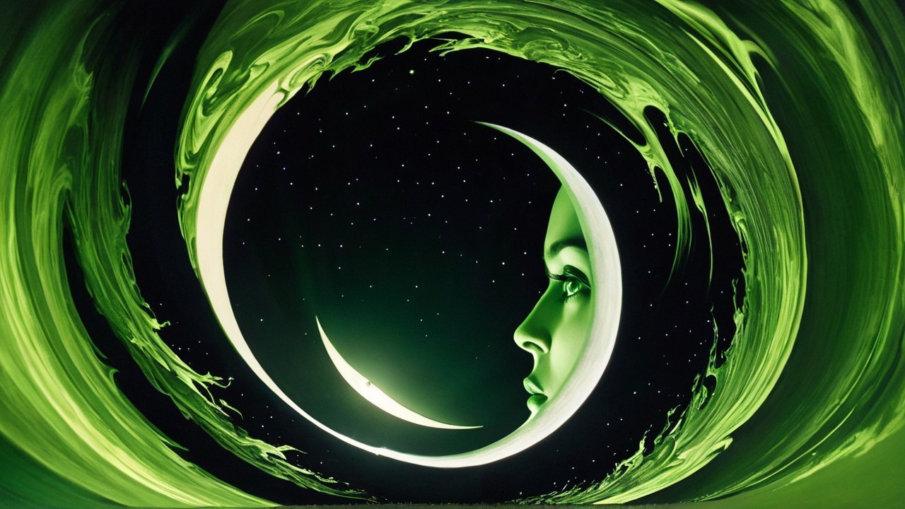 Prompt: Closest thing to art created by brilliant albeit sick mind, inspired by quirky dimensions of analog of Wojciech Siudmak - POV of :Distorted, dreamlike scene, inspired by quirky dimensions, viewed through a fisheye lens. A figure with a crescent moon head, human body, and swirly green flames, reminiscent of Nicolas de Staël's abstract expressionism, combined with the surrealist, bio-organic forms of Massurrealism and Peca Art. Incorporating the line work of Egon Shiele, textile patterns, and a touch of Wyeth's realism, in a post-apocalyptic, xeno-machinarium environment. Blending the styles of René Magritte, Fernando Botero, and the contemporary art of Ulla Thynell, Ed Binkley, and Steve Cutts, with a hint of Twig Noir's darkness.
