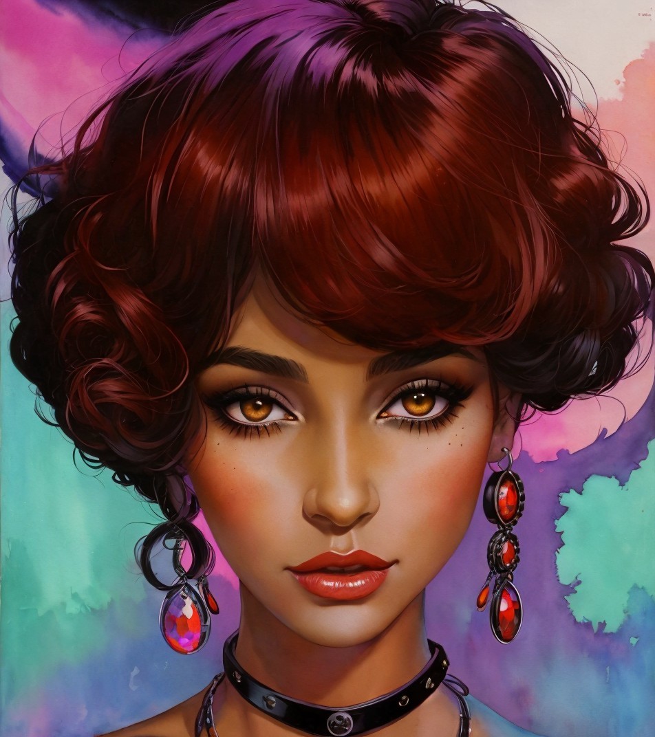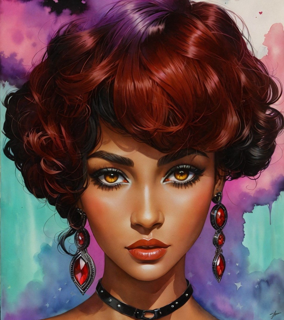Portrait of gorgeous female enchantress,  black curly hair,, american gothic 1.7, embossed strokes, inkpunk 1.8, plushy, sweaty, crisp, octane render, very detailed illustration, complexion 1.4, plasticity 1.4, tints of 1990s movie poster art, style by Meghan Duncanson and Overton Loyd and Didier Lourenço, wavery watercolor and ink splashes 1.9, style of1970s advertising art and space age style, ,stylized chipped portraiture, beautiful female face, ornamental details, plushy, lavish, 3d effects 1.8, shadow mapping 1.3, dynamic lighting 1.7, highlighted reflections, ambient occlusion 1.5, anisotropic filtering 1.7, dimmed dynamic lighting, wavery texture, tints of movie poster art, intricate black hairdo with lineage, vector 9:5,  earrings, raytraced shadows 1.8, triadic colour scheme pink blue black, creamy, american gothic 1.7, lavish, octane render, Anglocore 1.9, atompunk 1.7, retrofuturistic details, Streamline_Moderne, funky, anisotropic filtering 1.7, high coloring 1.9, grunge, acid spill, beautiful composition 1.9, coffinwood 1.7, hues, quilling, quaint, pop art illustration, stylized details, tints of fantasy art, beautiful artwork, stylized illustration 1.5, anisotropic filtering 1.7,