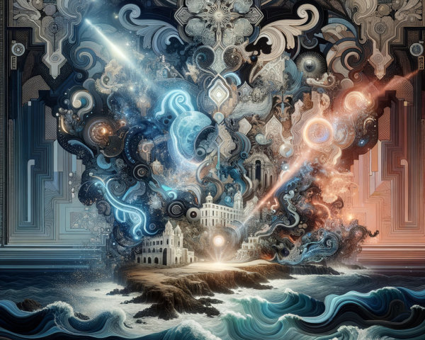 Prompt: A photograph of a visual representation of a soul being torn asunder. Translucent male youth ascends into a starscape, with scissors, hammers, flowering souls, coffins, skulls, strife, and dead trees visible. Encaustic oil on canvas motif with baroque visual storytelling, by a masterwork artist.