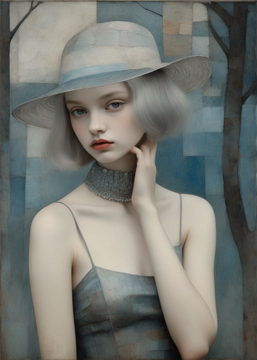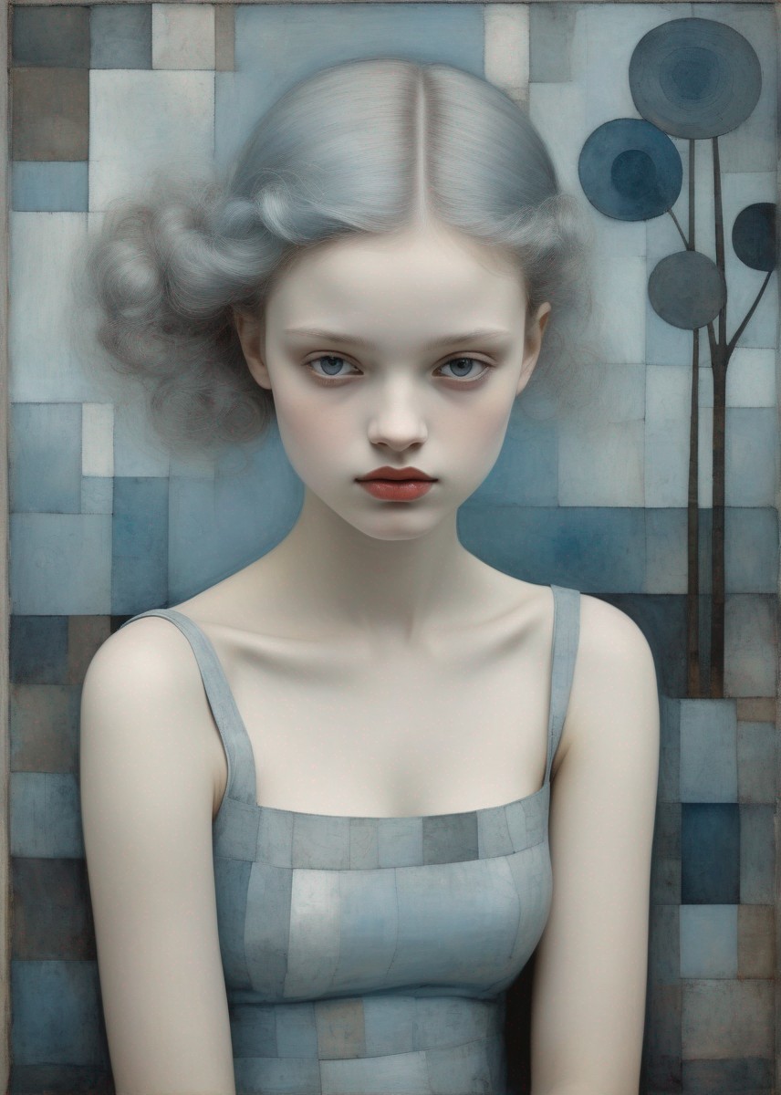 + Prompt:Beautiful girl's portrait in pale blue and grey, garden, Art Brut, moody, somber, desaturated colors, in the style of Paul Klee, Arthur Rackham
