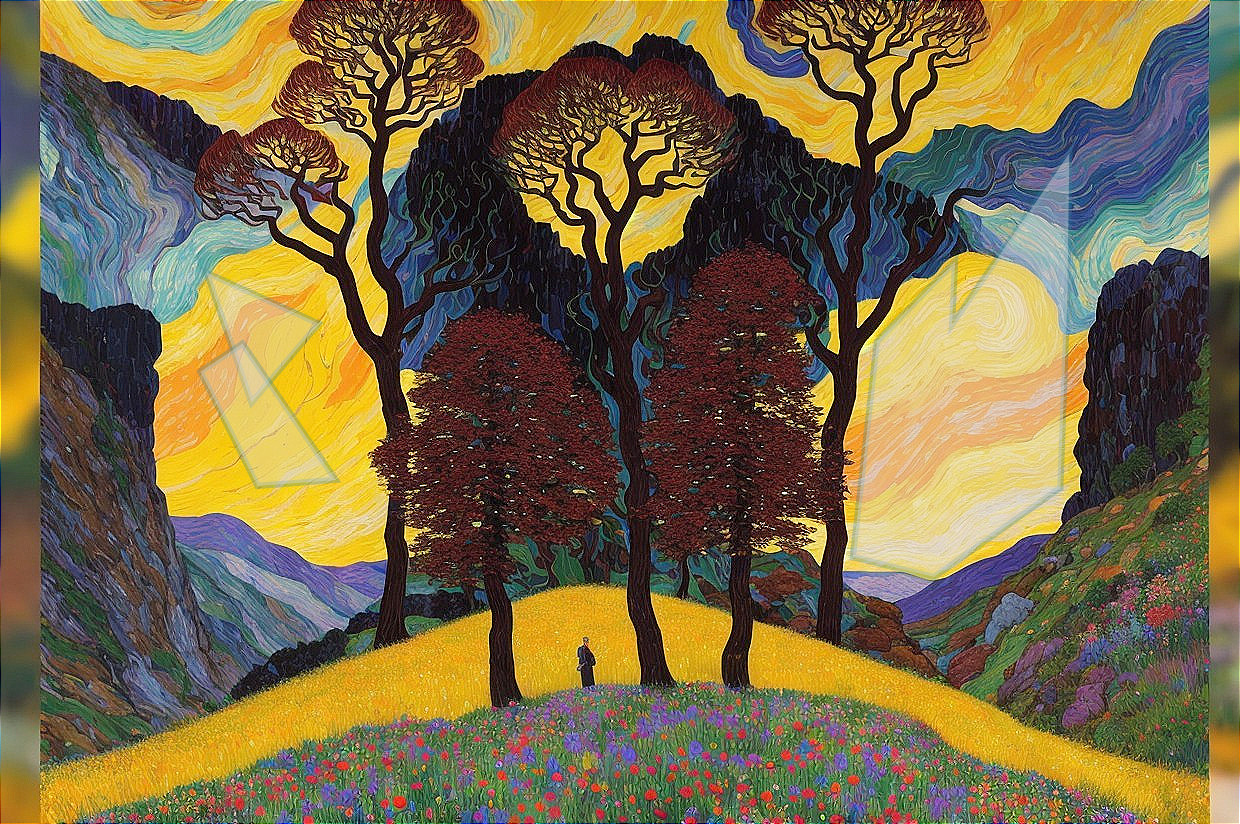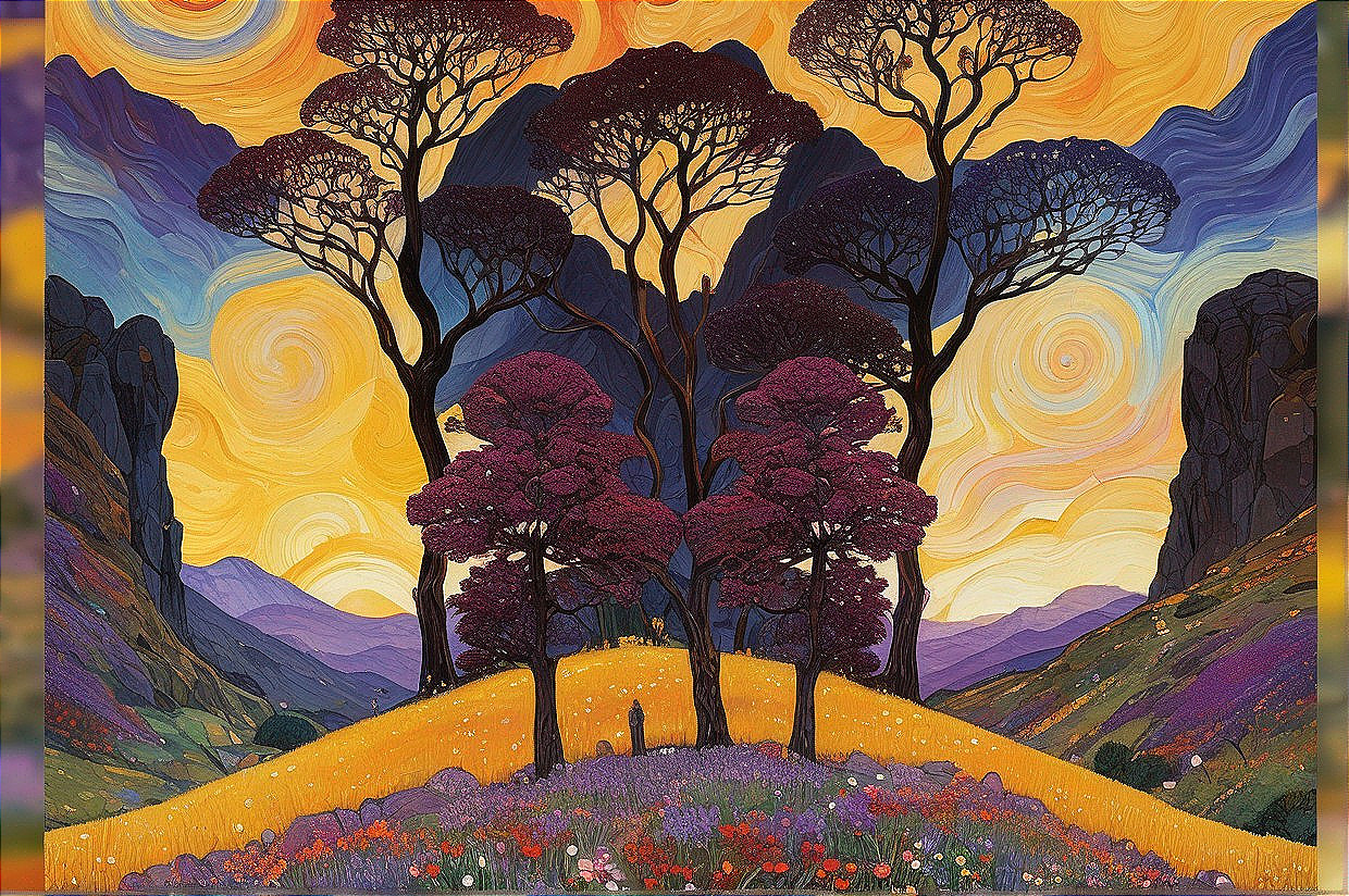 A vibrant, stylized painting of lush trees with red foliage against a swirling orange and blue sky, surrounded by a colorful, blooming meadow.