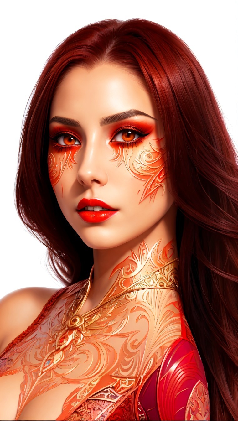 beautiful female vampire warrior, photorealistic digital art, textures like Schreger lines,  armored skin, brush oil on canvas, triadic color scheme beuge auburn red, 3d stylized illustration, fashionable, zentangle lines, upper body portrait, abstract style, brushstroke art, intricate ornamental details, fantasy details, vibrant colors, vector 9:7, cathedral surrounding