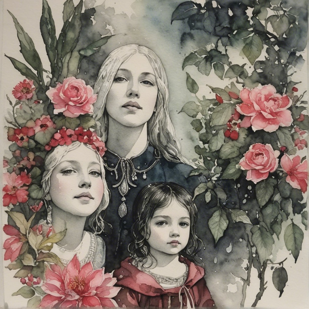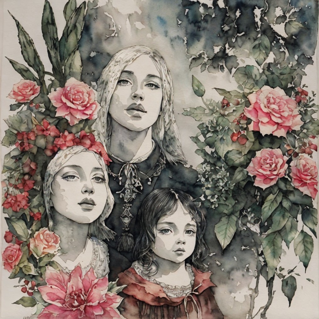 This watercolor artwork features three women amidst blooming roses and foliage. The central figure exudes grace, while the others, adorned with floral accents, add a touch of innocence and beauty.