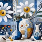 A vibrant still life features colorful vases with stylized flowers. The artwork combines bold shapes and bright colors, creating a lively and modern atmosphere.