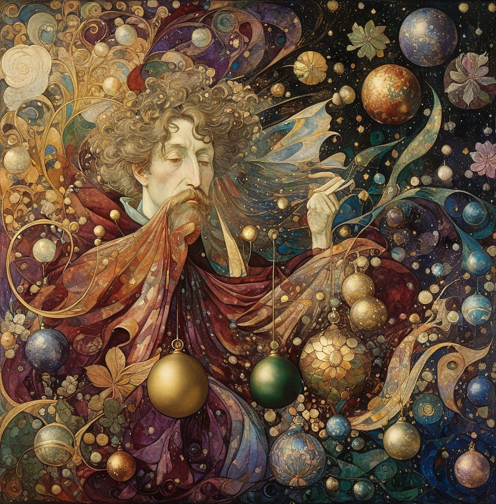 A luminous figure with flowing hair and a flowing cloak gazes serenely amidst swirling colors and sparkling celestial orbs, evoking a sense of cosmic wonder and ethereal beauty.