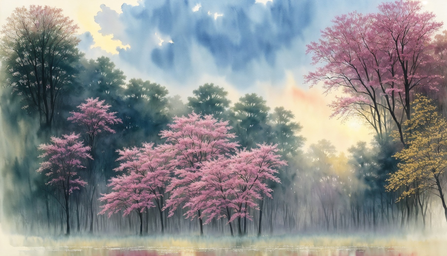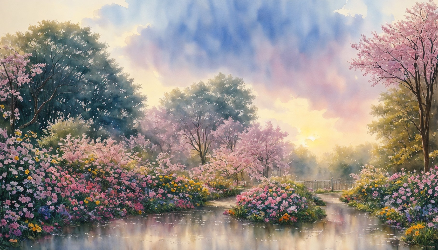 Prompt: Stunning work in the style of Anton Pick, Otto Wright, Hugo Pratt, cool day, peacefully falling raindrops, clouds, watercolor, architectural drawing, pen, ink color, dirty shades, a park of magical beauty, where the sun has just emerged from the horizon , gently illuminates a riot of flowers. The rays of dawn envelop each flower, giving it a special brightness and warmth, reminding of the awakening of a new day and the endless cycle of life. beautiful with clear small flocks of cherry trees in bloom, Award winning masterpiece, soft and beautiful colors, fantastic landscape award winning extremely detailed rose tones artistic art visionary attractive and beautiful wildflowers whimsical colors vivid colors muted