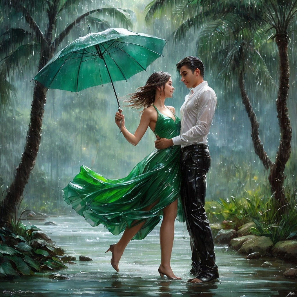Prompt: "Once upon a time in a heavy rainy day a young beautiful Beautiful couple, enchanting love night, dancing flowing, splashing the water drops; wearing green wet translucent clothes; by Andrew Atroshenko, art by Artgerm and Greg Rutkowski, smooth and Alegent, fantasy, taro trees are surrounded by river"