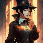 A mystical woman adorned in a vibrant, weathered hat decorated with flowers and gears, stands against a fantastical backdrop of steam machinery, exuding an enchanting, vintage vibe.