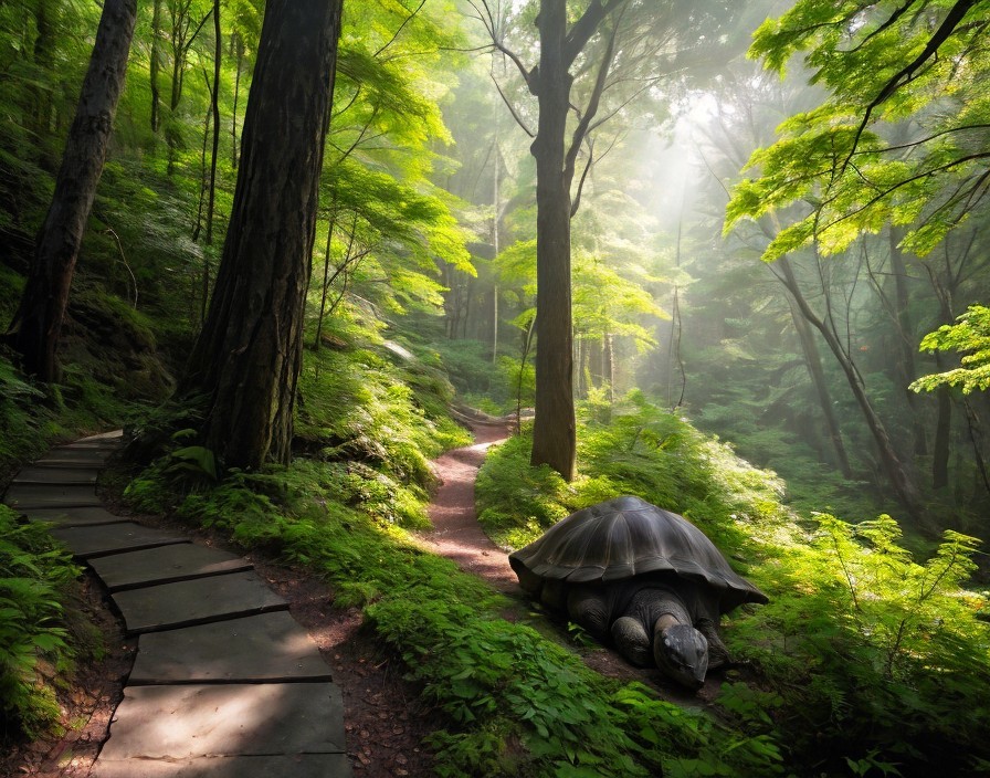 In old Asian tortoise descends a mountainside along a well-worn trail. He is homebound from a long journey and seeks to find comfort in his eternal moss borough deep in the quiet primordial forest.