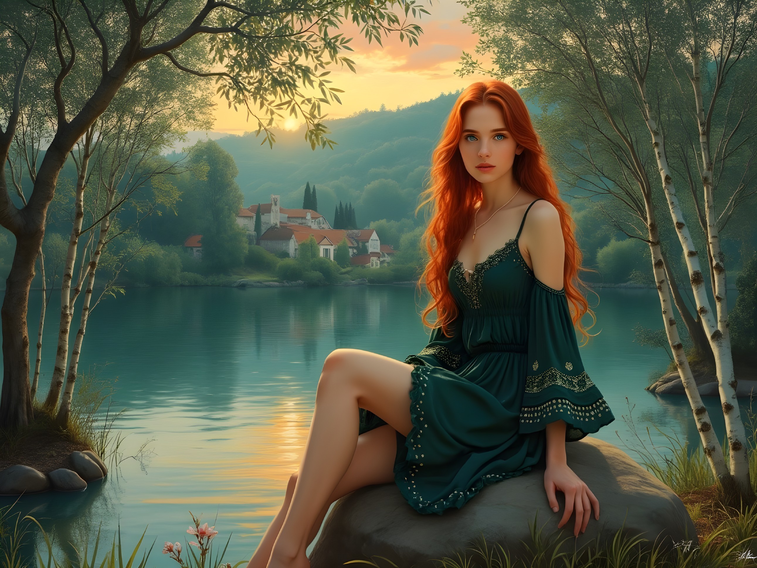 A serene scene features a young woman with flowing red hair, dressed in a green dress, sitting on a rock by a tranquil lake surrounded by lush trees and a quaint village in the distance.