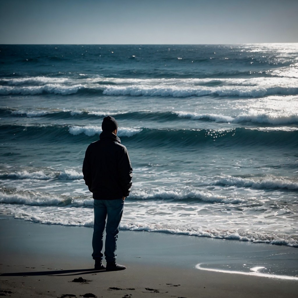 Prompt: "An introspective moment captured by the ocean, a lone figure facing the vast expanse, with a shadow beside him mirroring moments from his past, the interplay of light and dark symbolizing the complexities of his life's narrative, Photography, prime lens with a shallow depth of field"